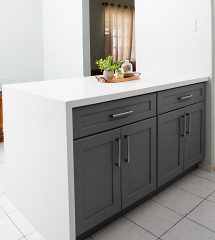 Elaine's journey to her dream kitchen began with the pivotal choice of cabinets; she chose a blend of grey and white shaker style, to create a bright and open feel. She paired these with stainless steel cabinet pulls seamlessly matching her appliances and from there the foundation was set!