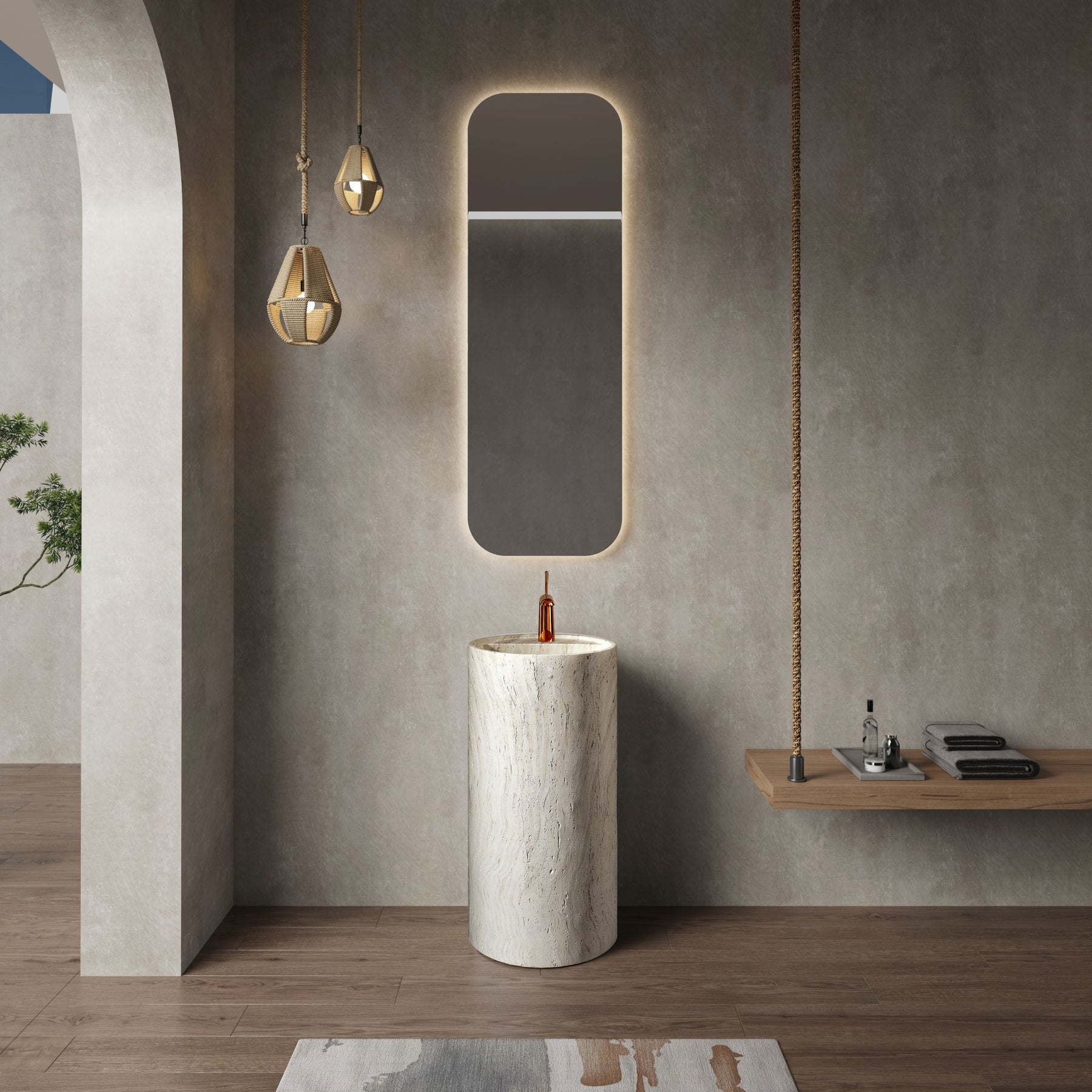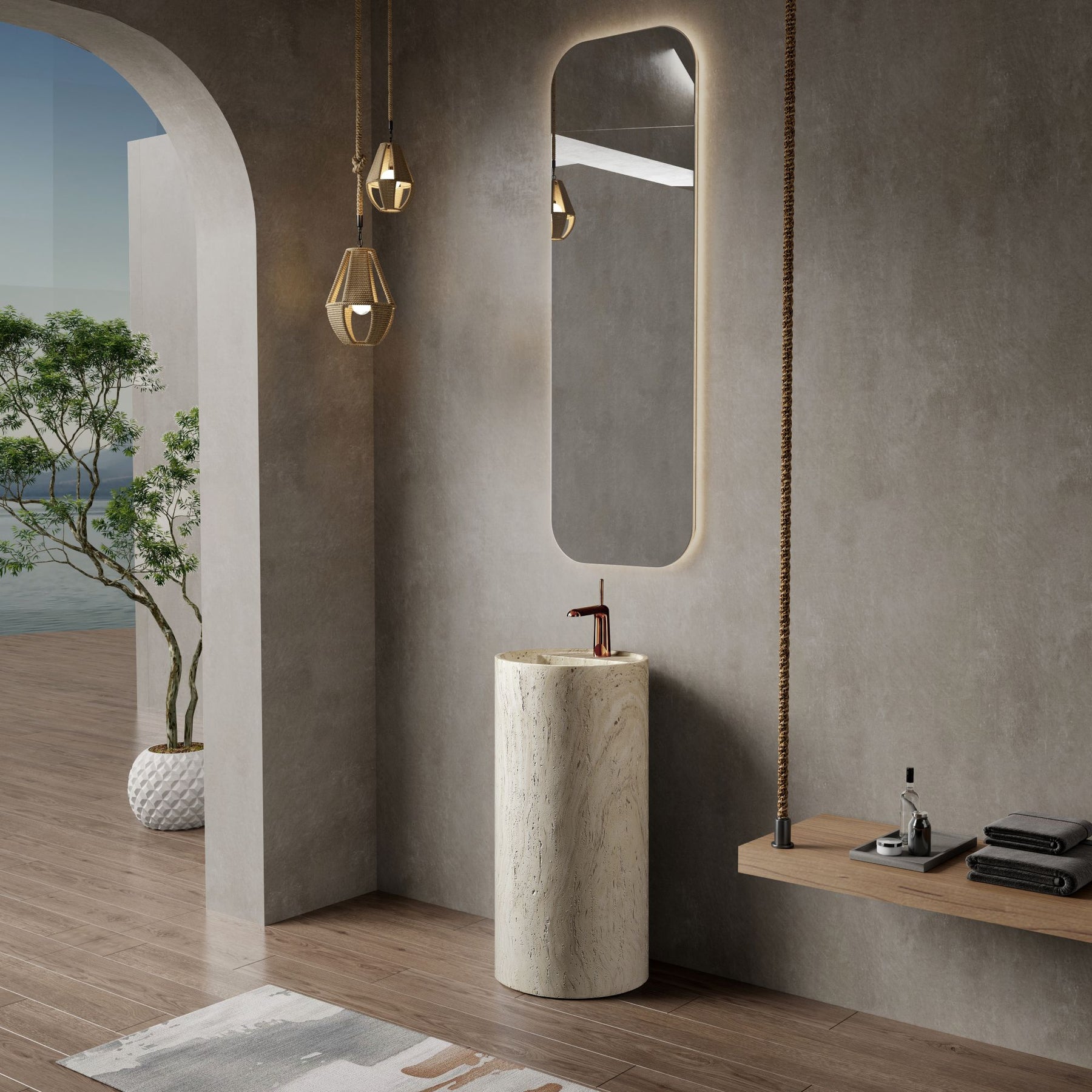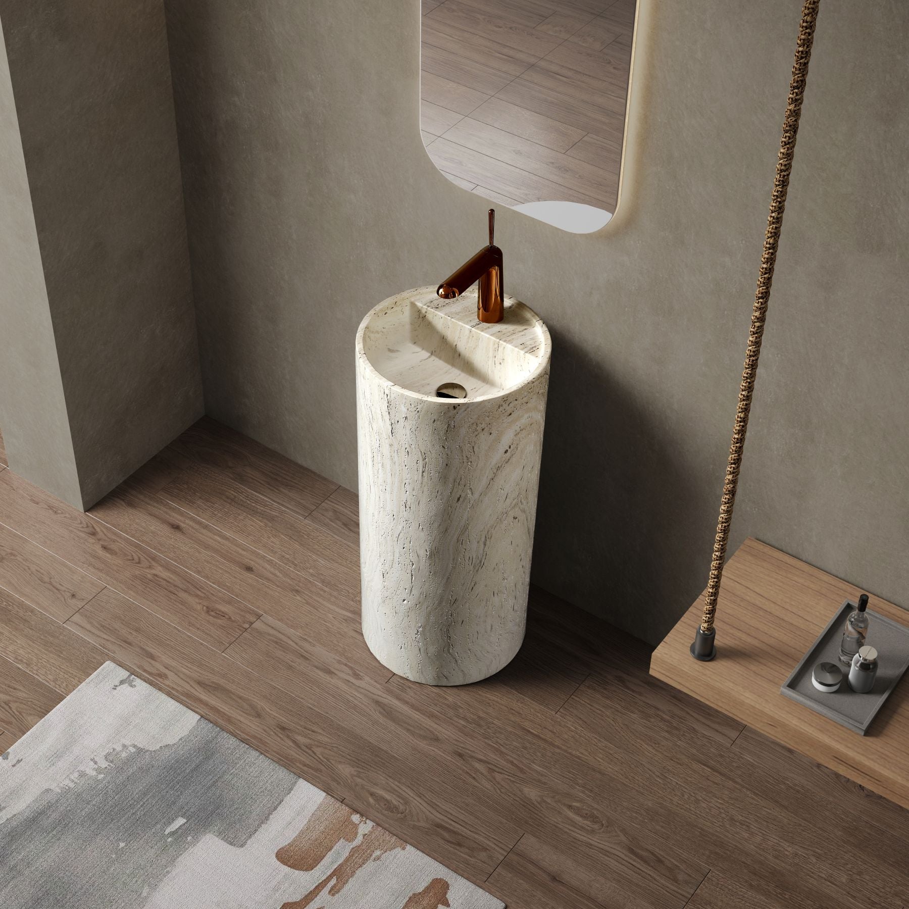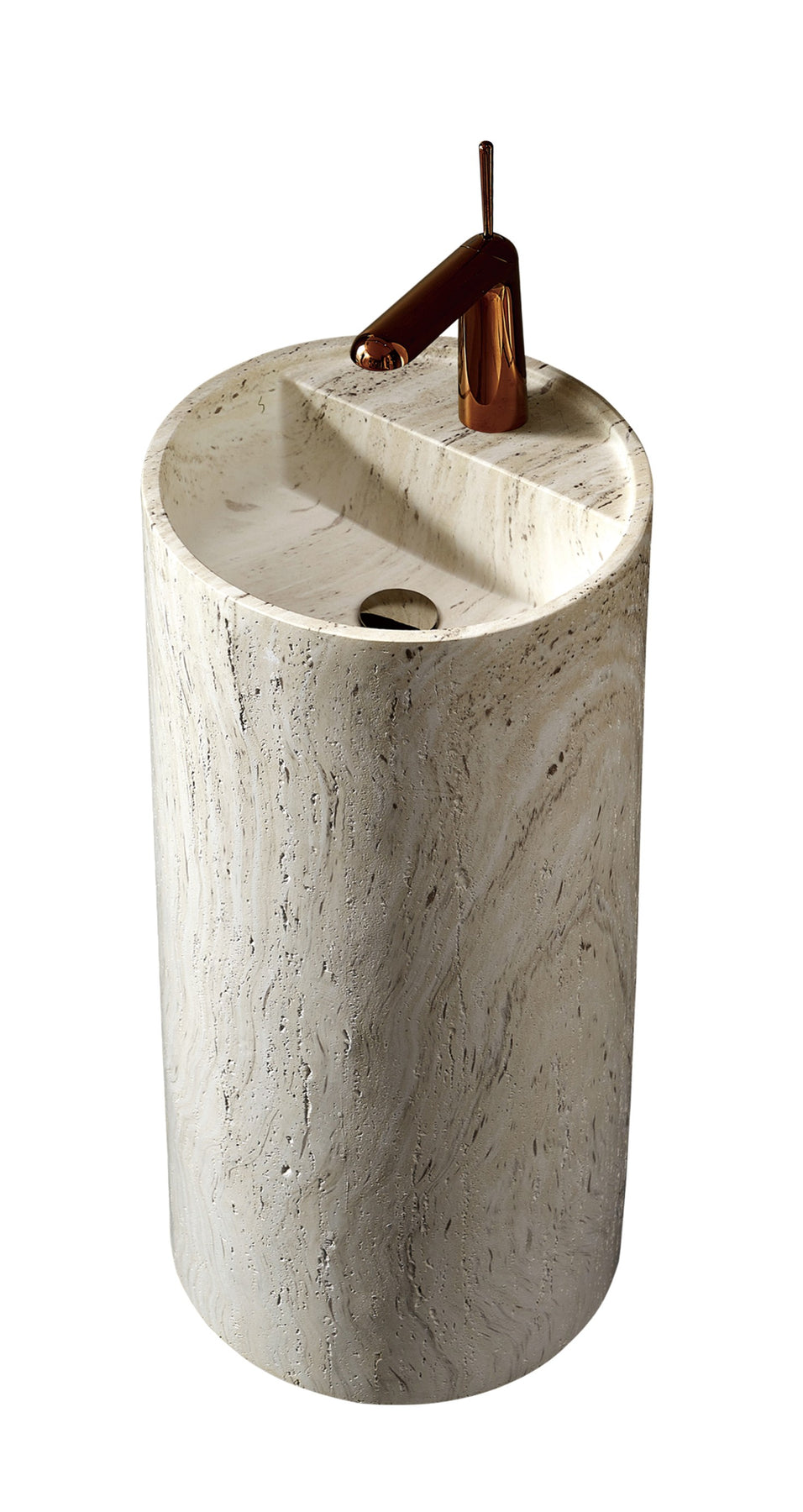 Regular price J$89,000.00A perfect balance of style and strength. This freestanding pedestal sink features the organic beauty of travertine texture crafted in durable artificial stone, offering timeless design with long-lasting performance.