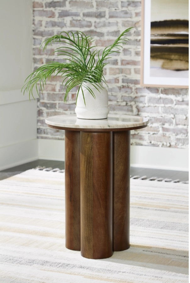 Regular price J$44,900.00Simply elegant. The Henfield accent table combines the beauty of wood and stone, appealing to the luxurious but inviting vibe of your contemporary aesthetic. A beige marble top pairs with cylindrical legs in a brown finish, giving this refined piece an aura of welcoming warmth. It’s a homey take on highbrow design, balancing approachable character with your taste for elevated styling.