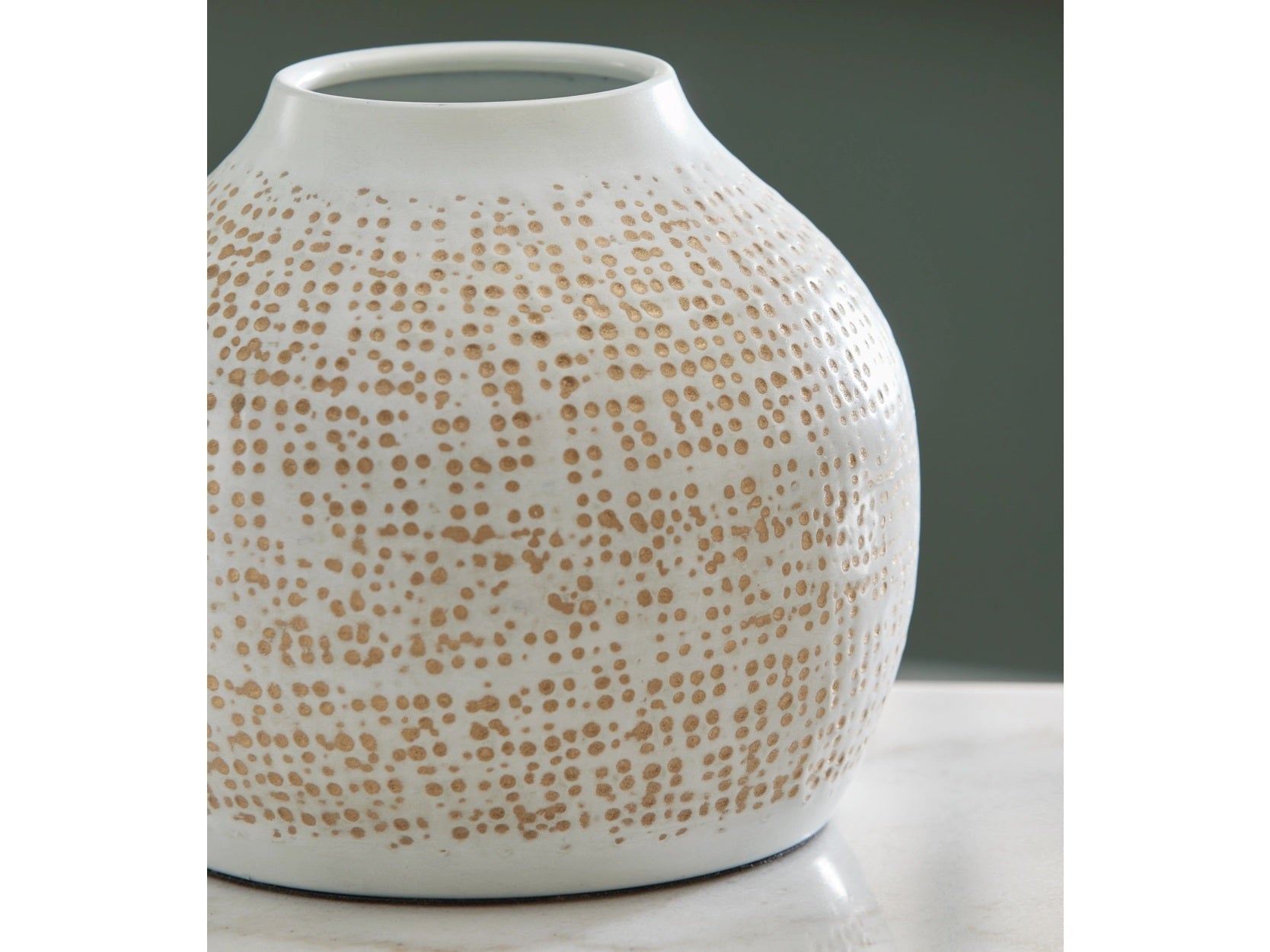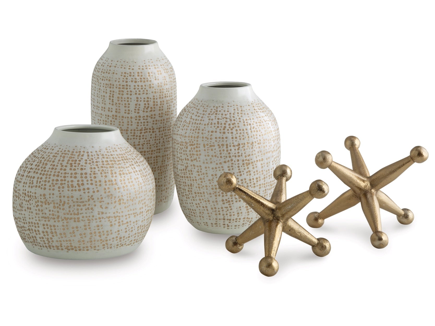 Elevate your decor with the striking Vinburn accessory set. Its sleek white vases, adorned with delicate goldtone accents, are perfect for displaying your favorite faux blooms or standing alone as minimalist statements. They're paired with bold geometric sculptures, creating a dynamic and sophisticated look for modern spaces.