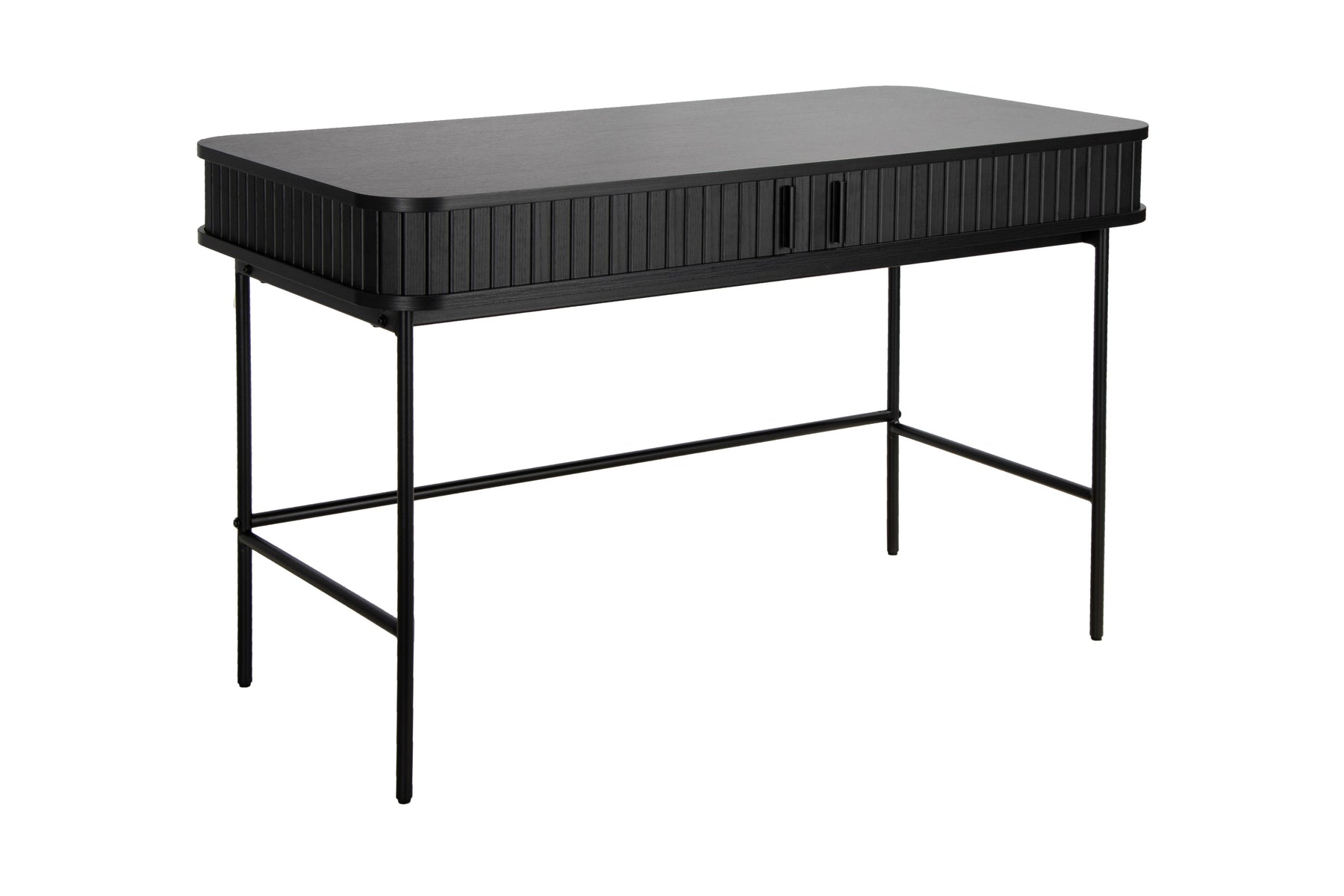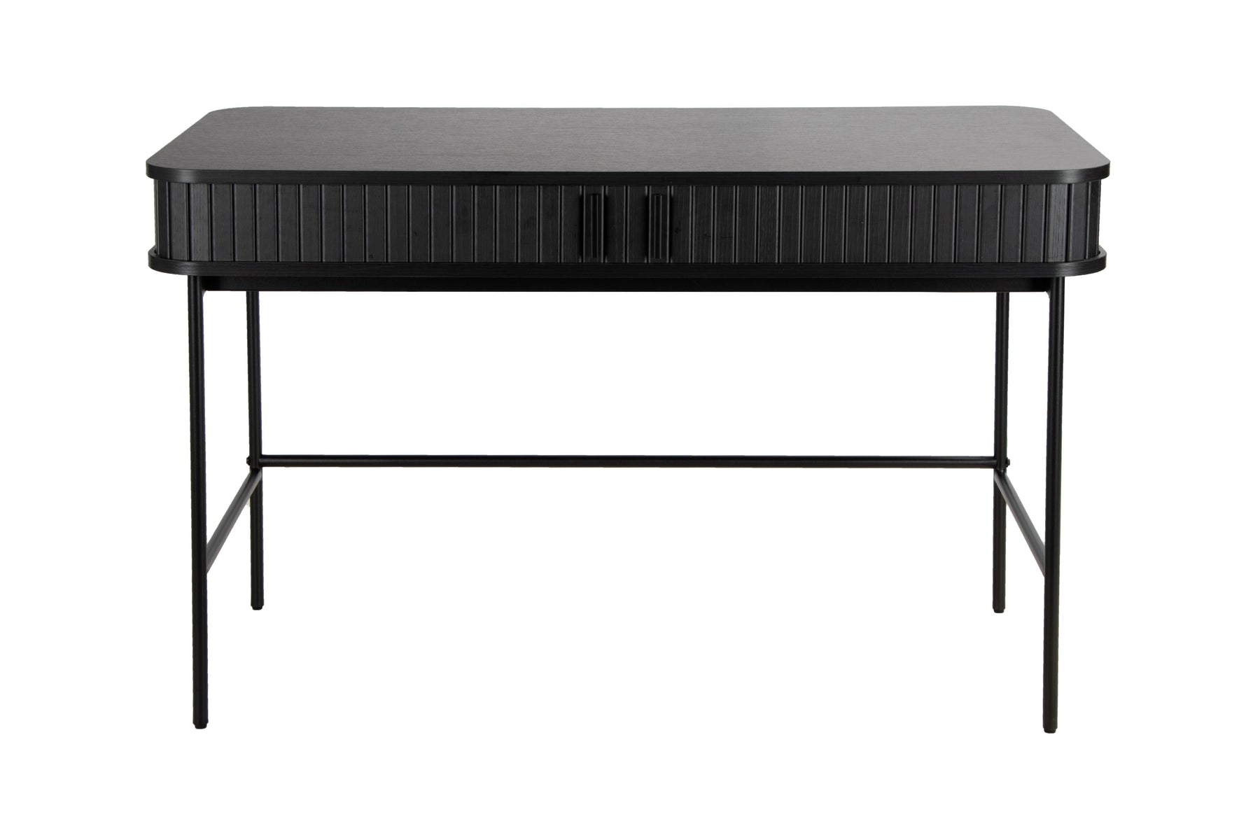 Regular price J$29,900.00This modern black writing desk features a sleek rounded-edge top, slatted front detailing, and slim metal legs for a clean, contemporary look. With discreet built-in storage, it blends style and function—perfect for a home office or workspace.