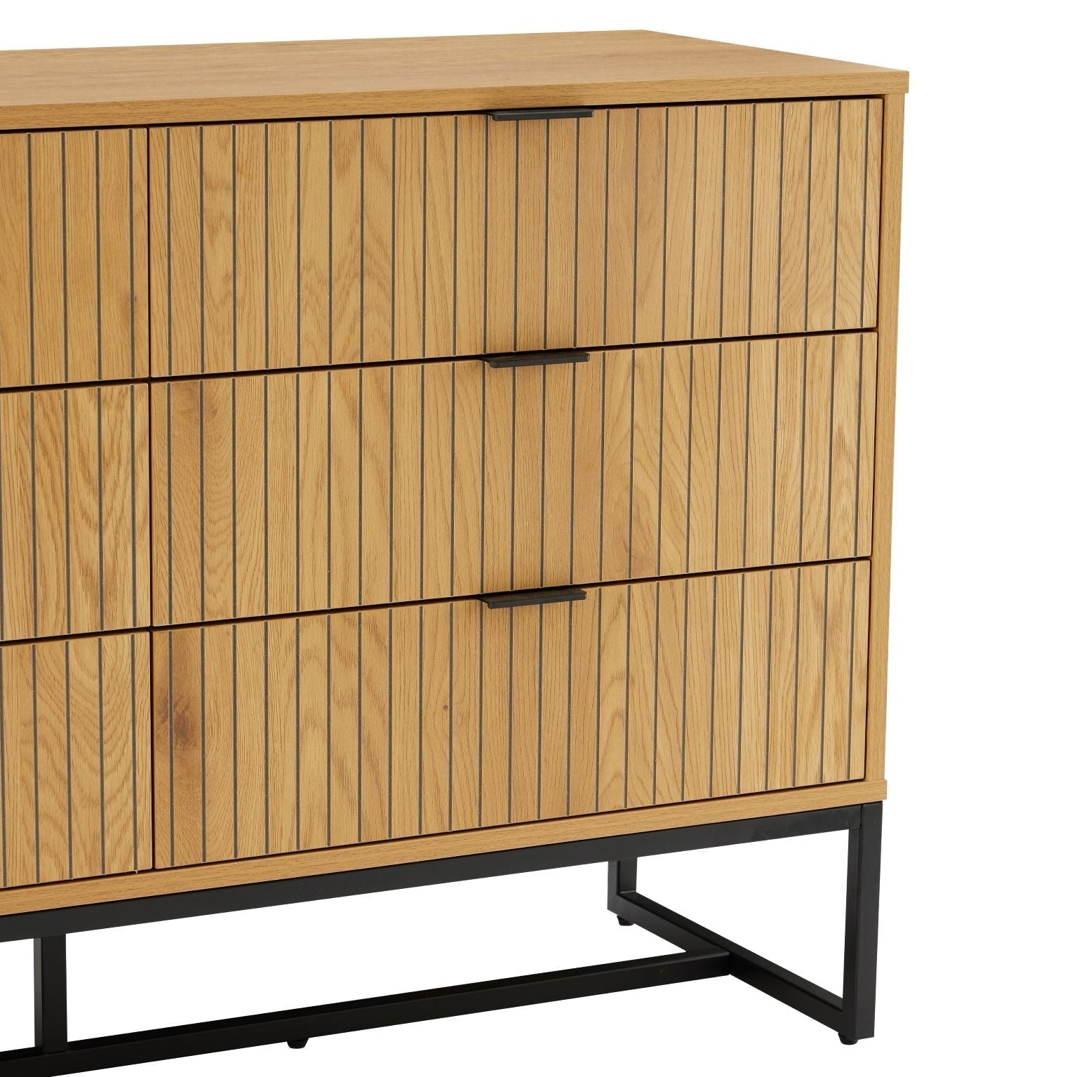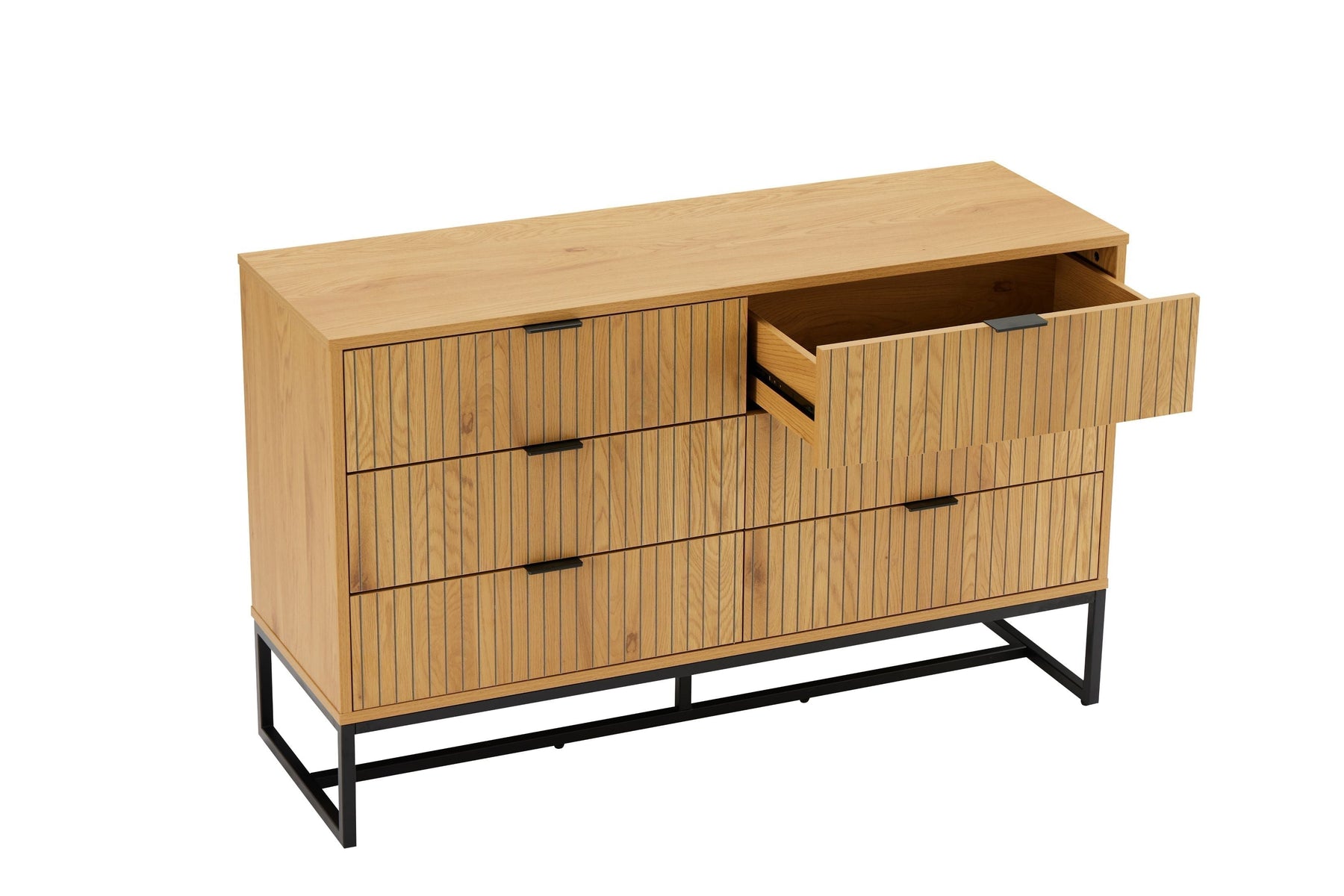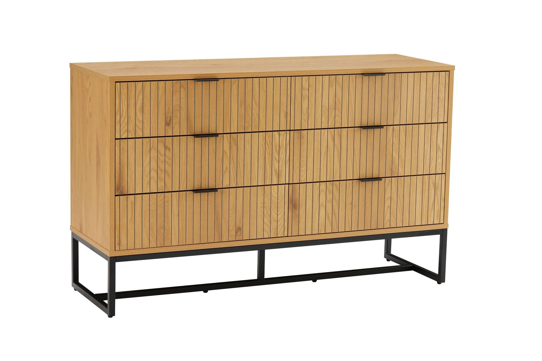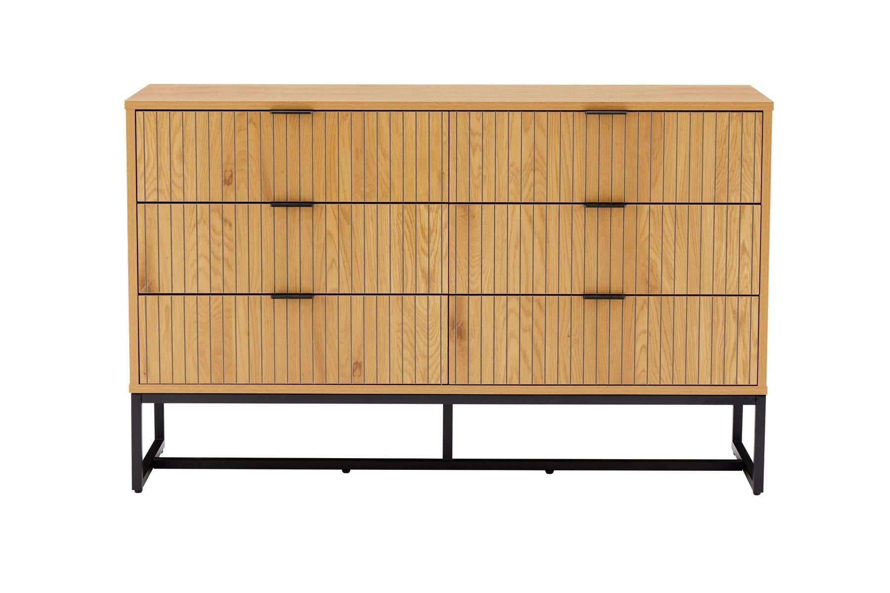 Regular price J$49,900.00A sleek oak and black 6-drawer dresser with carved walnut-style fronts and metal accents, blending modern design with generous storage.