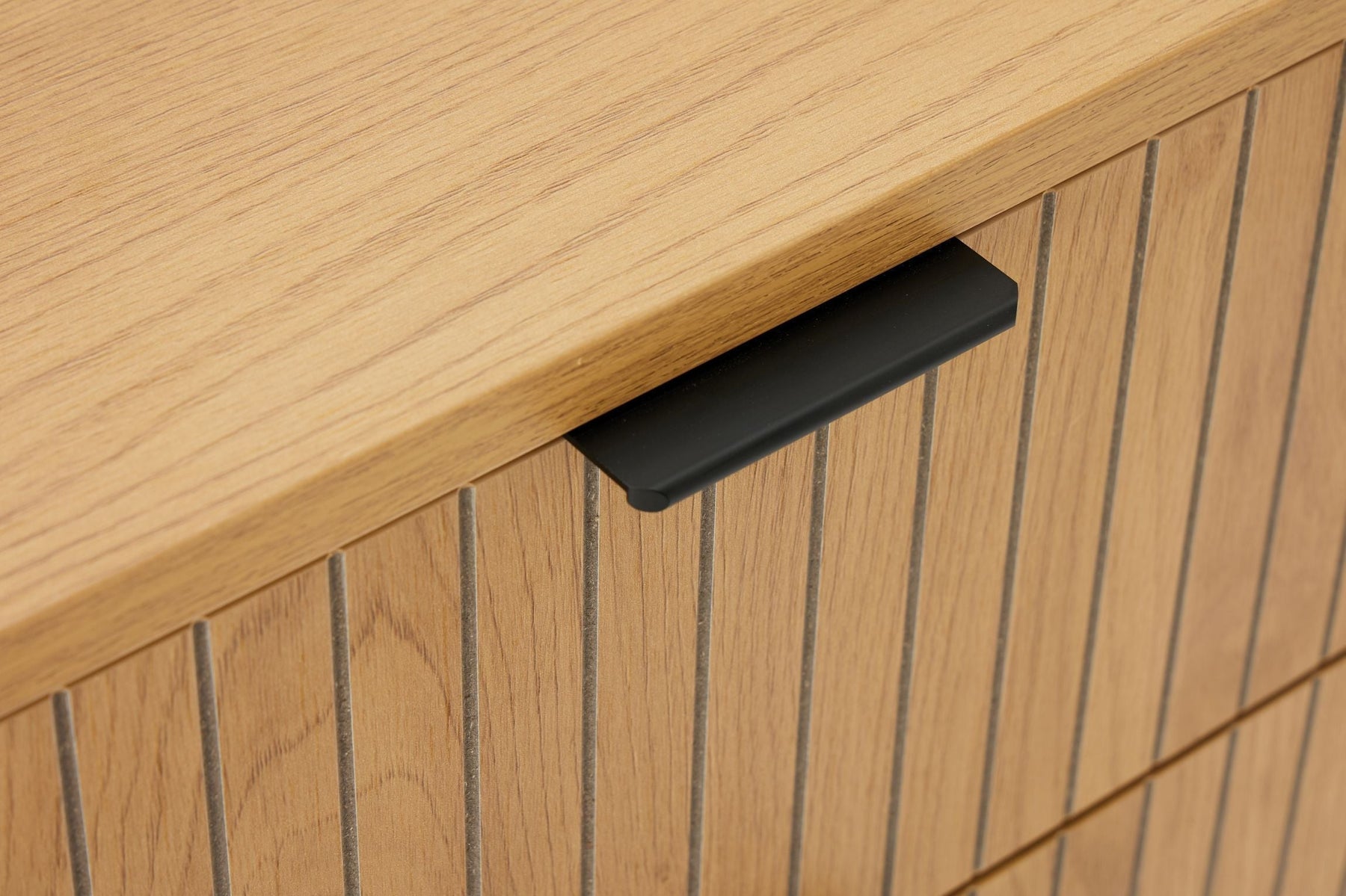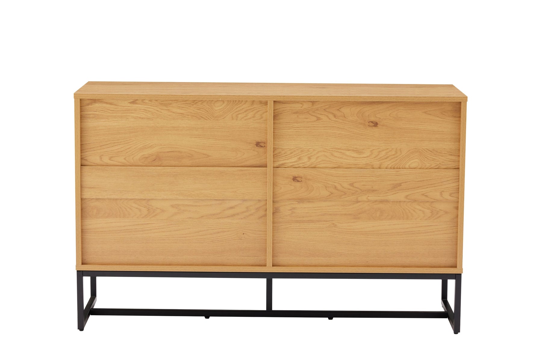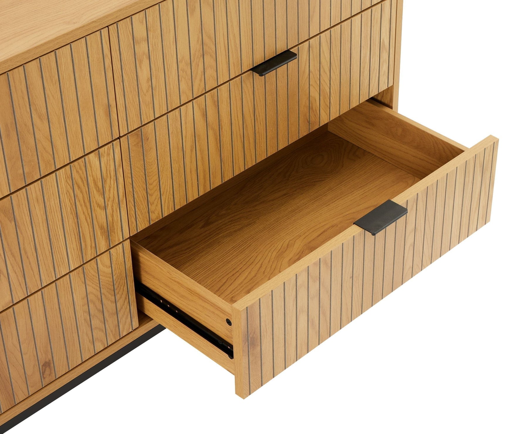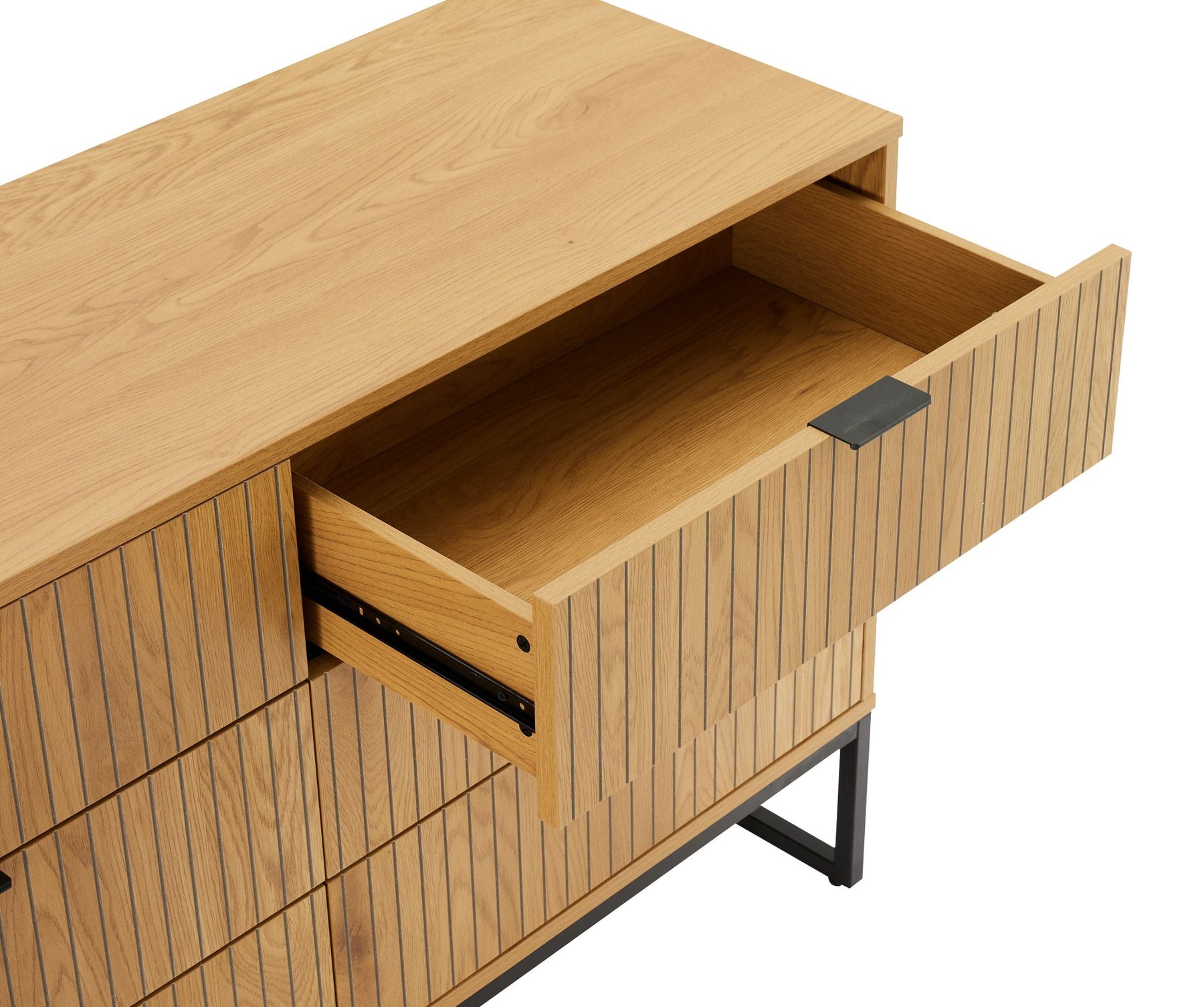 Regular price J$49,900.00A sleek oak and black 6-drawer dresser with carved walnut-style fronts and metal accents, blending modern design with generous storage.