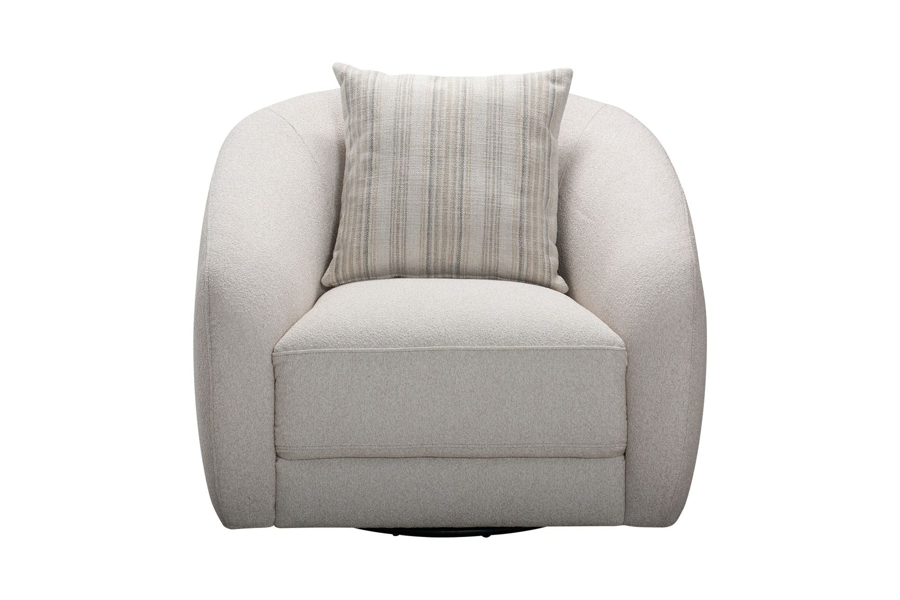 Designed with rounded curves, plush cushioning, and a smooth swivel base, it offers cozy seating with a modern, relaxed look. Includes one matching pillow for added comfort.