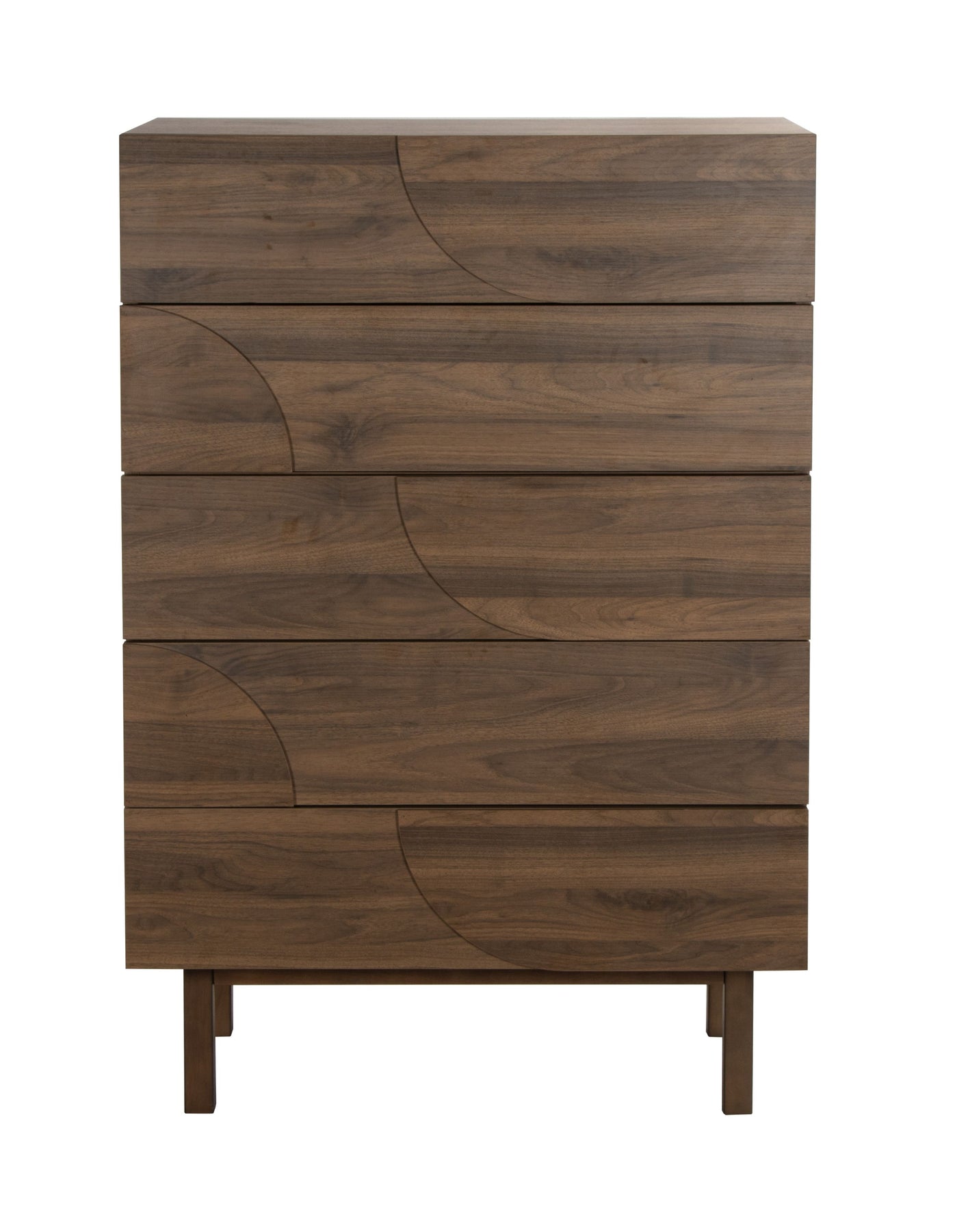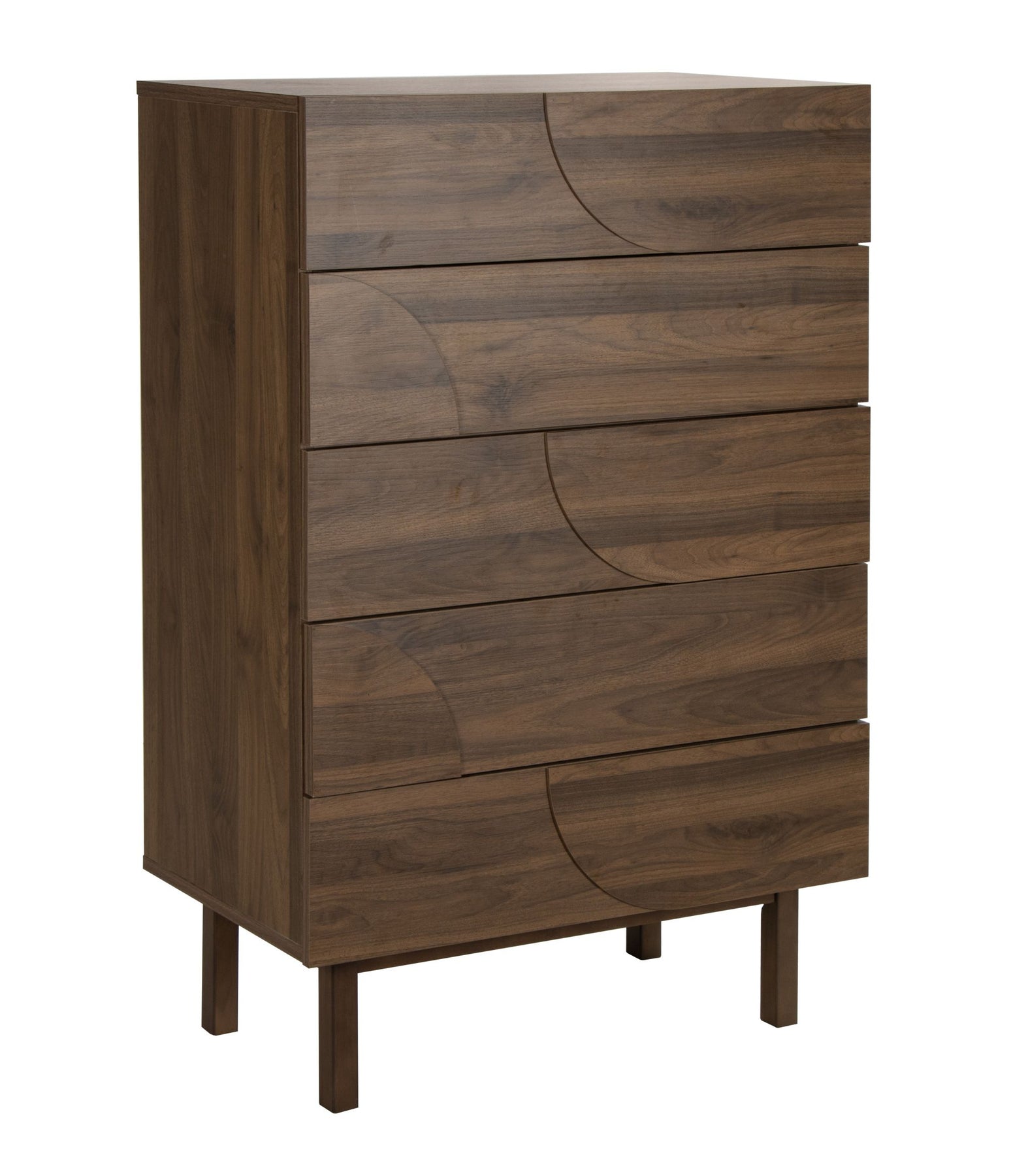 Regular price J$49,900.00This modern 5-drawer chest features a warm walnut finish and sculpted curved detailing across each drawer front. Designed with clean lines and elevated legs, it offers generous storage while keeping your bedroom looking sleek and contemporary. Perfect for organizing clothing and essentials with style.