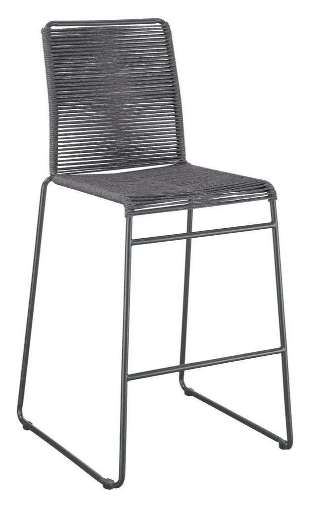 Create visual texture with this contemporary rope woven stool. A tall and slender metal frame in a gunmetal finish, wrapped in charcoal tone rope around the backrest and seat, offer a restful spot for family and guests at elevated dining areas. The metal frame offers an open, airy feel with its slim seat and angled legs, and extra support with a lower footrest. With a sled-style base, this stool slides gracefully up to a bar top or counter height tabletop for drinks, meals and more. Lastly, a dark hue throughout creates a dramatic, natural vibe for modern farmhouse and boho-inspired homes.
