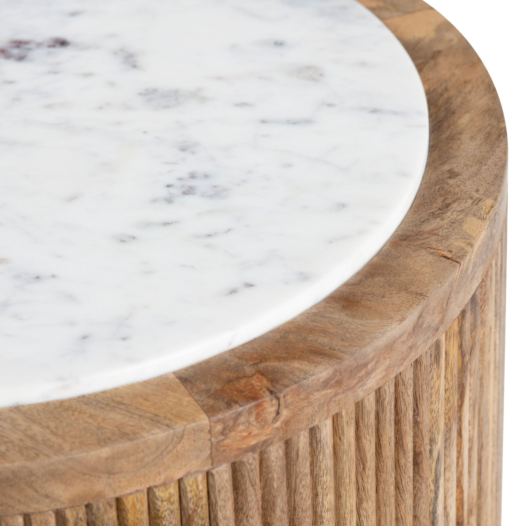 Elevate your living space with the Crestview Collection Santorini End Table, a harmonious companion to the Santorini Cocktail Table. Crafted from reeded brown mango wood, this end table radiates warmth and character. Its recessed white marble top exudes sophistication, making it the perfect addition to your coastal-modern inspired decor.