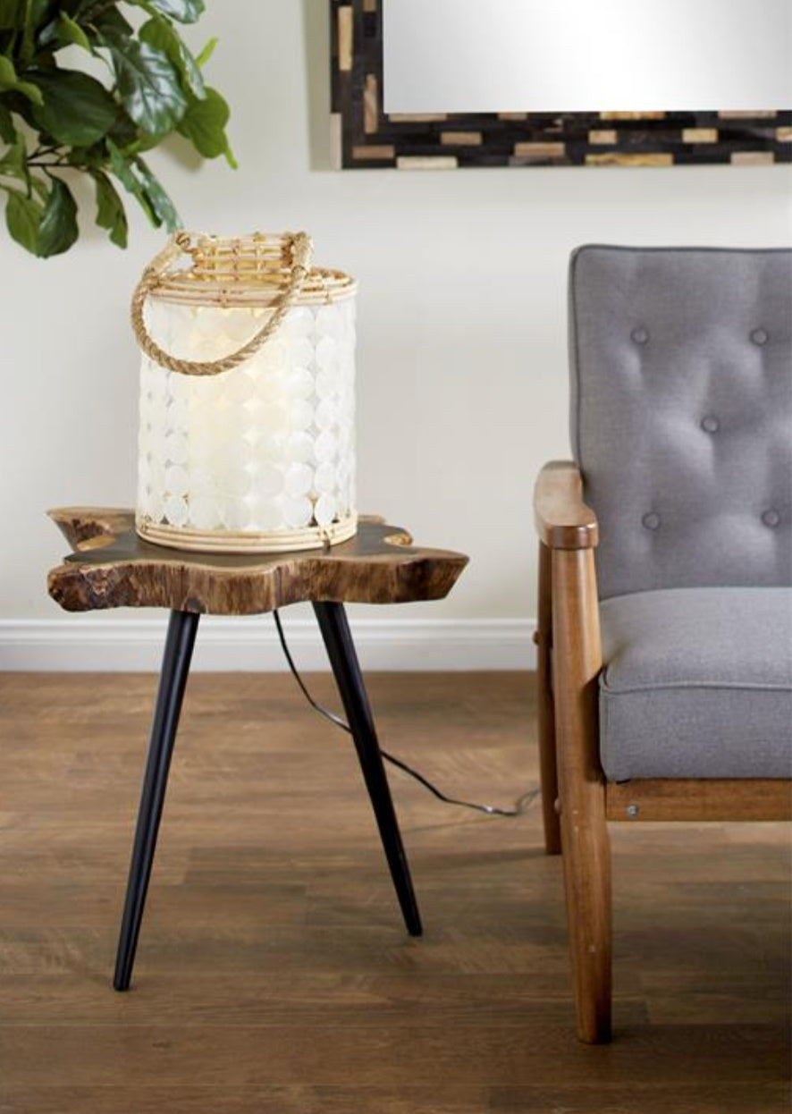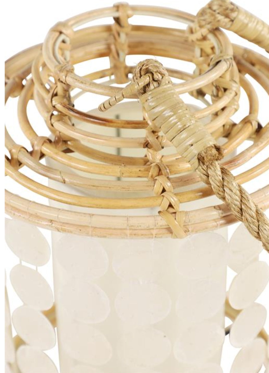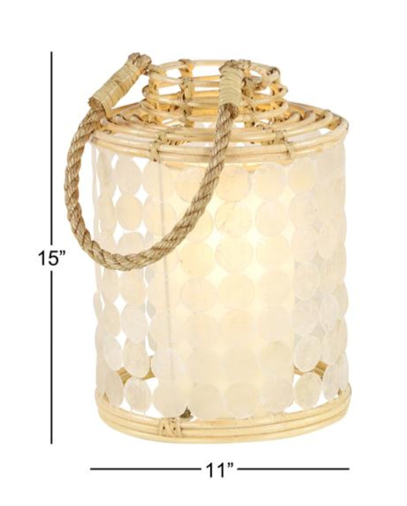 Bring coastal style to your space with this large, round, white capiz shell and naturally light beige-colored African rattan lantern light with a rope handle at the top. The luminescence of the shells creates a glow from the interior light bulb’s shine.