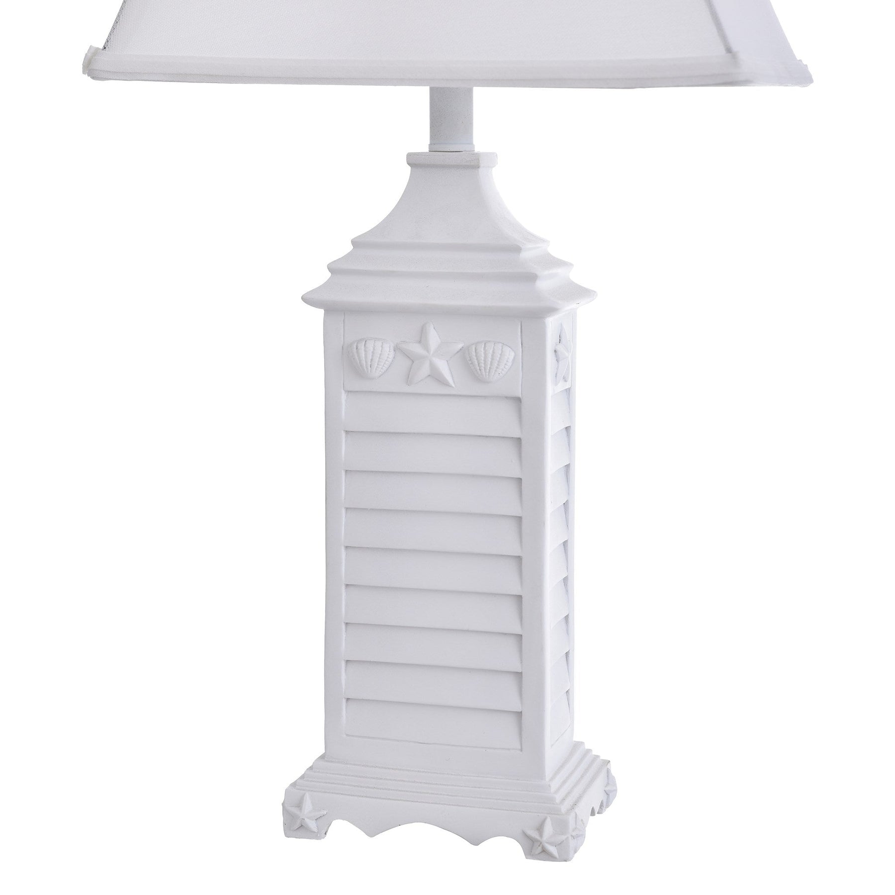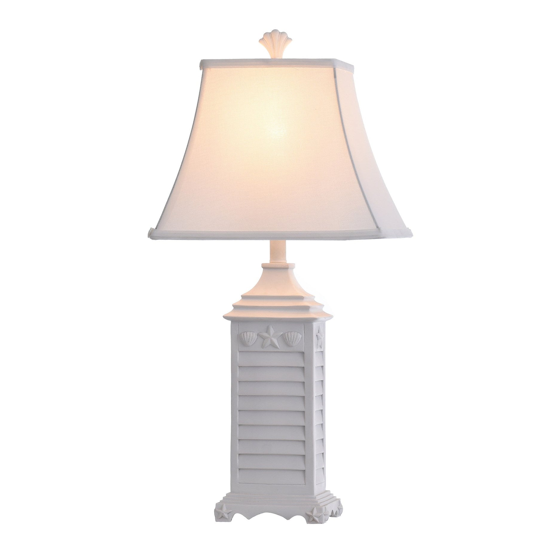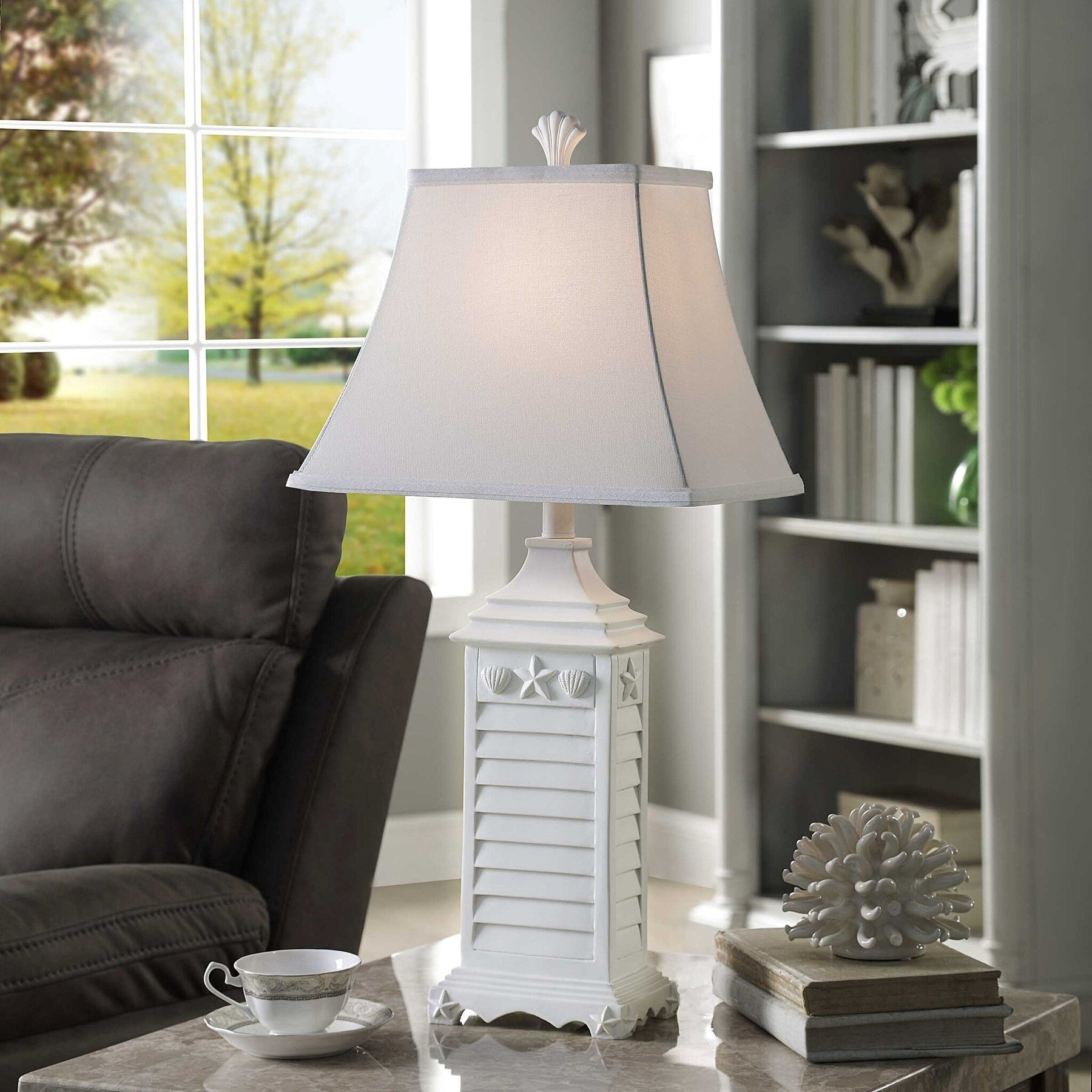 Nautical theme table lamp in white of monterey oatmeal fabric shade.