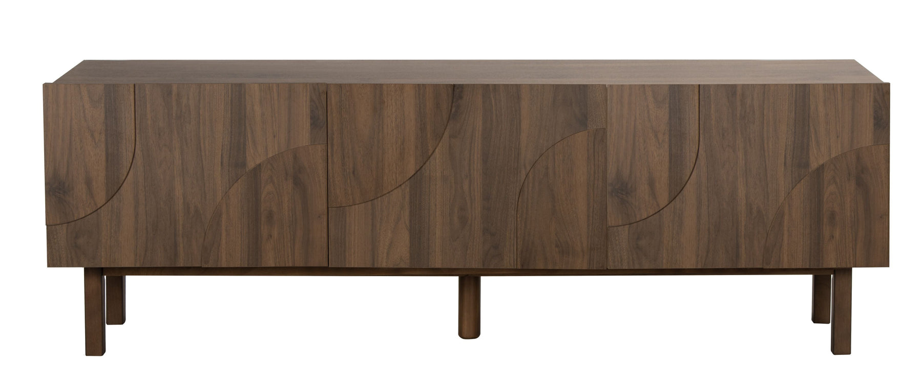 Regular price J$39,900.00This modern walnut TV console features sculpted curved door detailing and clean, minimalist lines. Elevated on slim legs, it offers generous hidden storage behind its smooth cabinet doors—perfect for organizing media devices and keeping your living space refined and clutter-free.