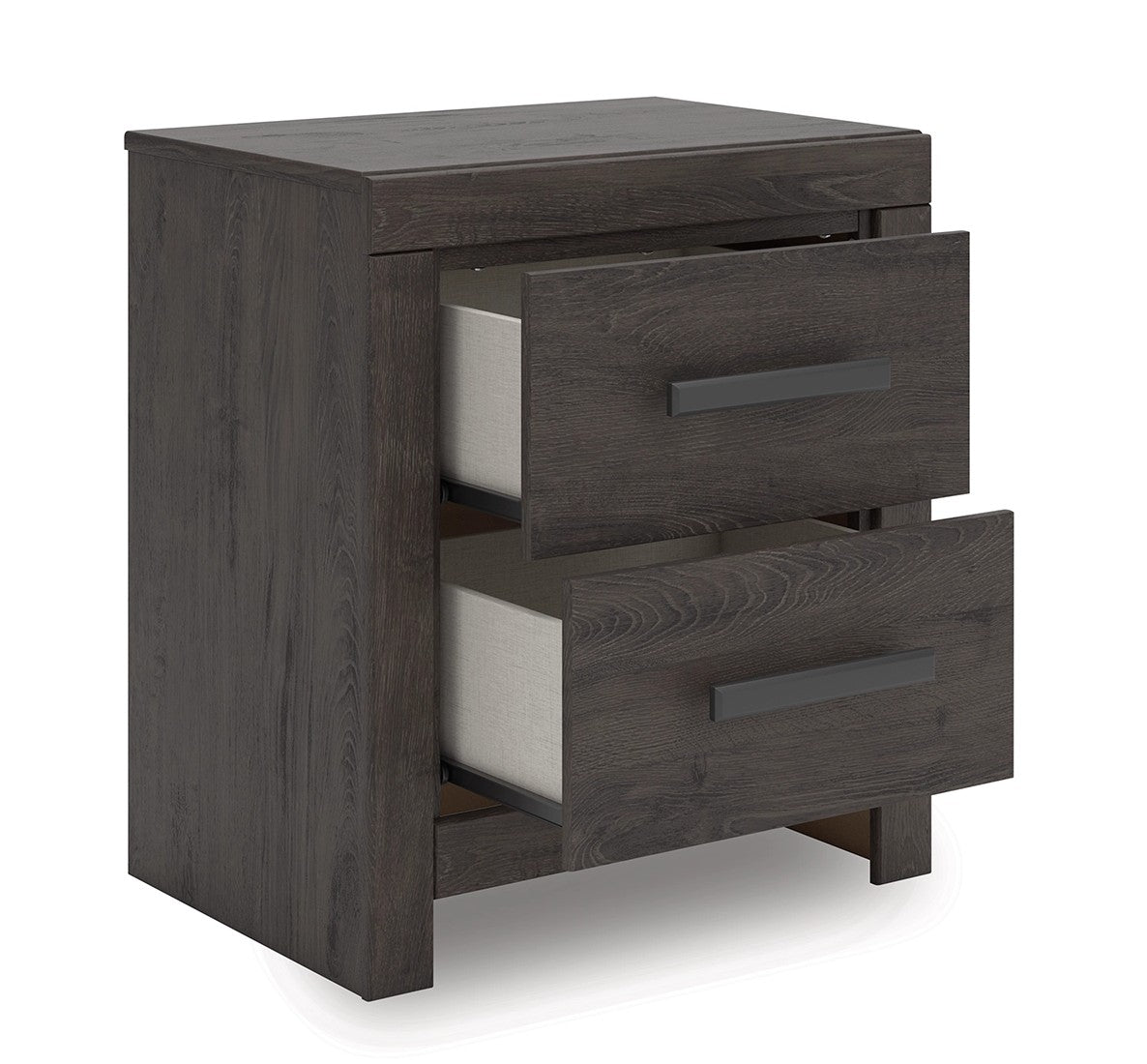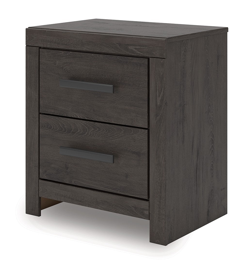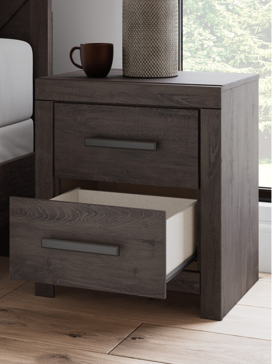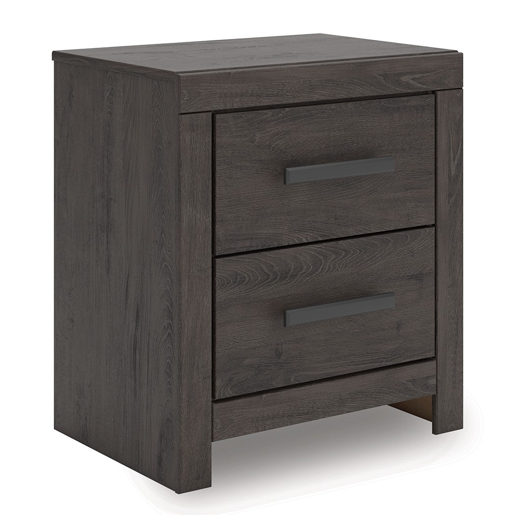 Designed with everyday style in mind, the Prendonea nightstand is a simply chic approach to modern living. A dark charcoal finish blends black and brown undertones, creating a versatile look that effortlessly pairs with your existing pieces. And for must-have function, two smooth-gliding drawers store bedside essentials in charming fashion.