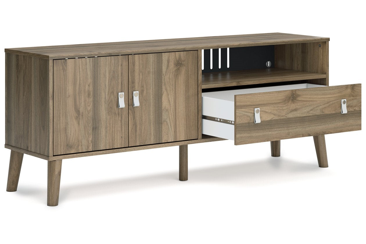 Dare to take minimalism to the max. The Aprilyn TV stand has a richly relaxed feel thanks to its honey brown finish over replicated wood grain. A drawer, open shelf and cabinet provide just the right amount of living room storage, while magnificently mod splay legs compellingly complement the streamlined design. And with two sets of faux leather pulls that allow you to customize the TV stand to suit your space, there's no doubt about it: This contemporary piece is sure to become a classic.