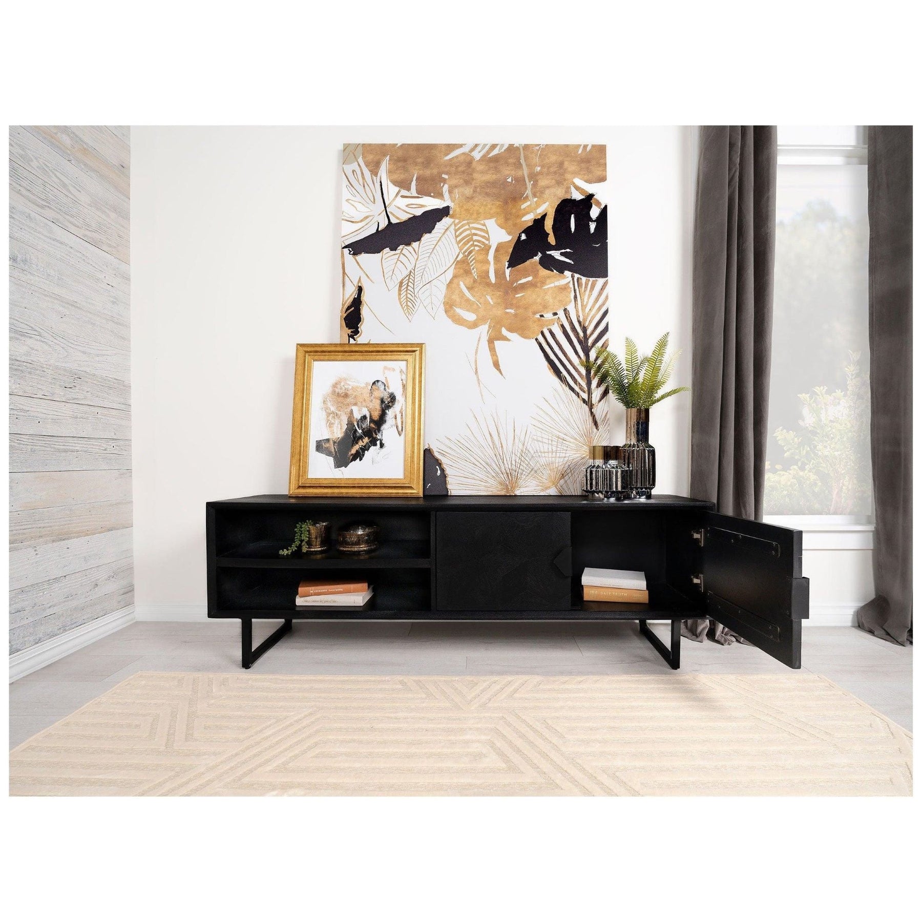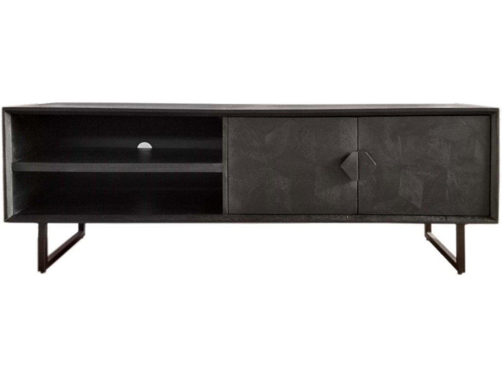 A dramatic charcoal black finish coats wood products construction, adding a bold look to this casual yet elegant TV stand. Gather entertainment-related gear and organize it in this tasteful stand built of mango wood with a rustic aesthetic. Set atop black finish iron bracket legs, it creates a sturdy venue for a large flat-screen TV. Components find room in two side compartments, as incidentals and media may be stashed on a fixed shelf behind two side doors with ornate iron hardware. Avoid clutter with a pre-cut wire management hole.