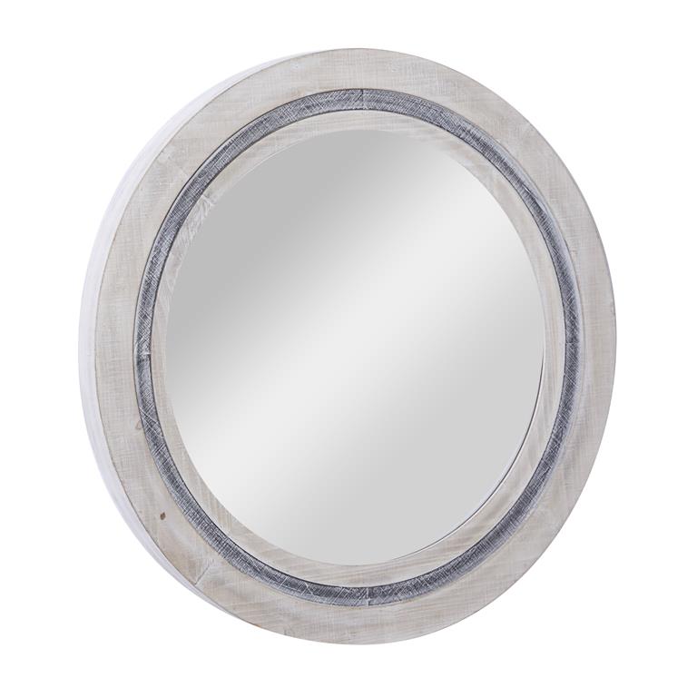 This decorative wall mirror features a distressed white and dark gray wooden finish.