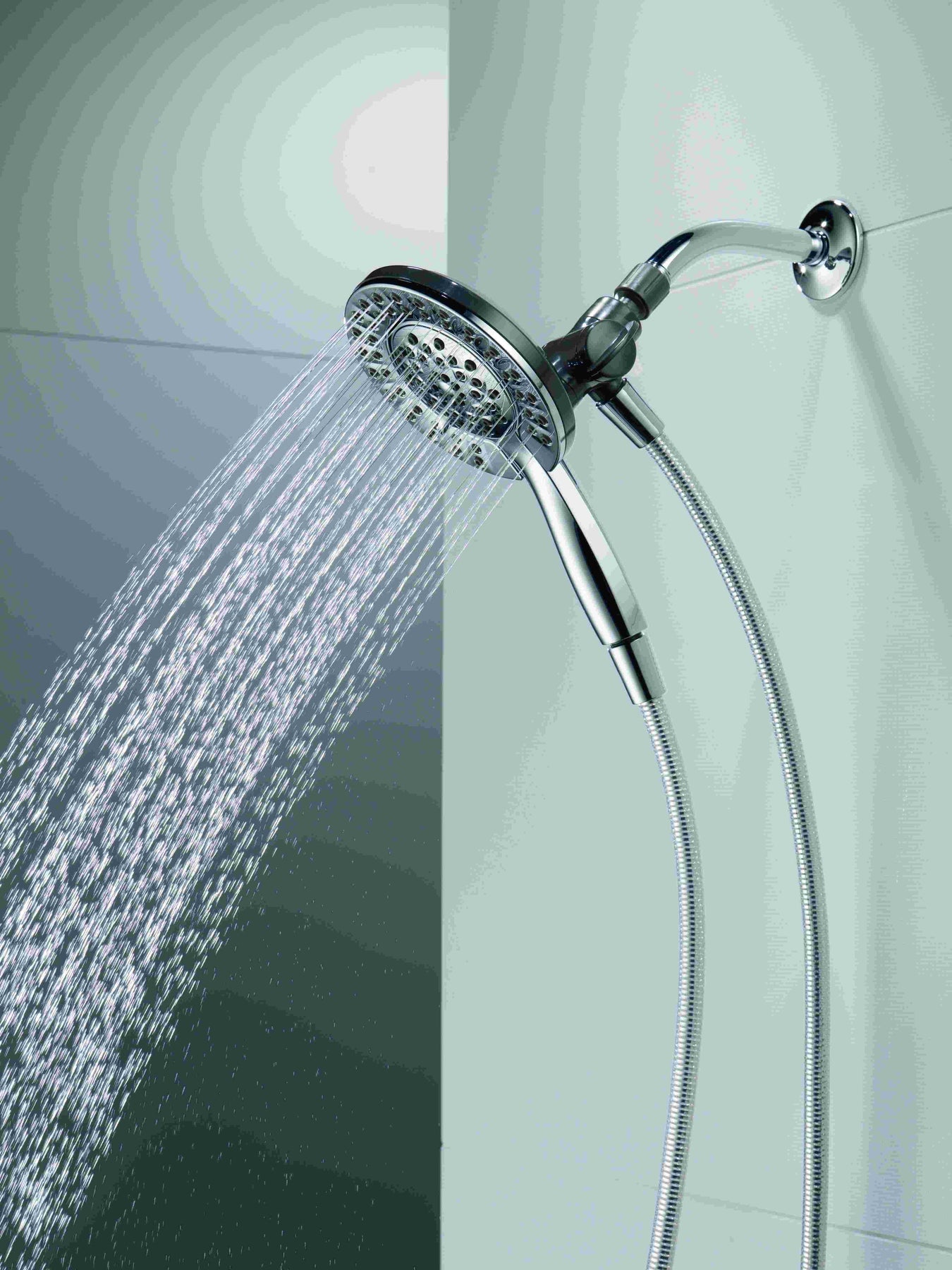 • Integrated hand shower docks securely into shower head when not in use